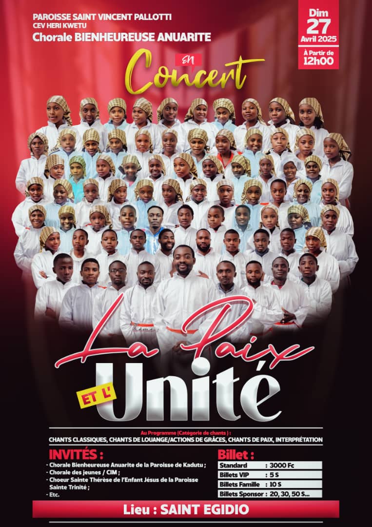 La Chorale BIENHEUREUSE ANUARITE de la Paroisse Saint Vincent PALOTTI organise un concert de paix et d'unité à 12h00 dans la Salle Saint Egidio.